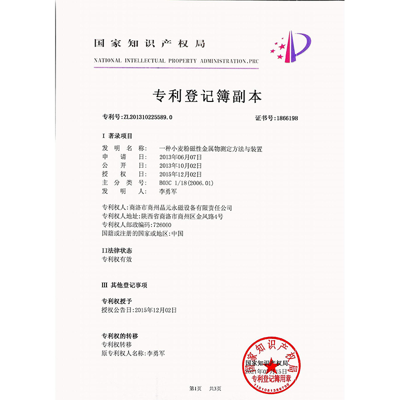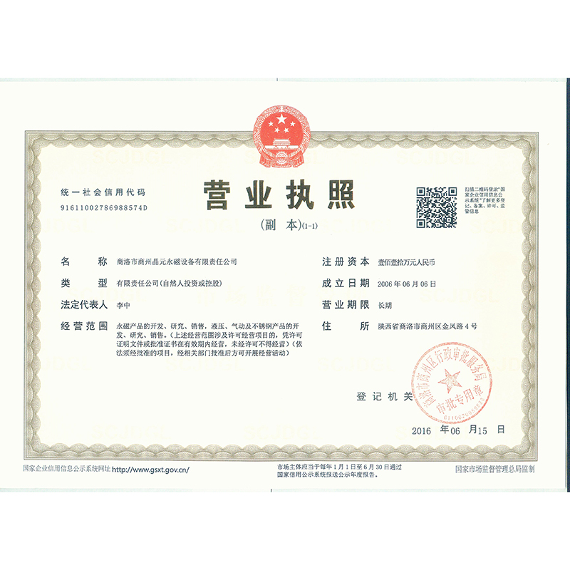 商洛市商州晶元永磁设备有限责任公司于2006年注册,其前身是1994年成立的”商州市稀土永磁工业应用研究所“,拥有三项发明专利,公司系列产品已销售至山东、辽宁、甘肃、福建、河南、内蒙、深圳、海南、西安及本地。公司已拥有强、中、弱比较全面的各类磁选设备,强磁性设备可提高传统选矿行业回收率和产率,弱磁性设备为永磁高梯度磁选机(中试阶段),可用于粉体干法提纯,弱磁性选矿。